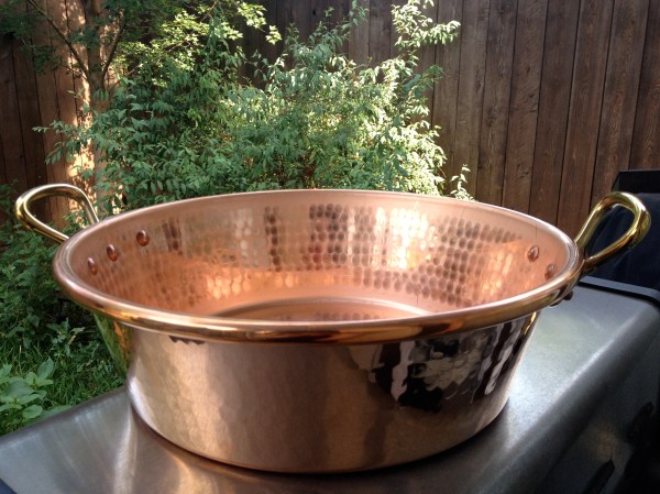 Look at that! Is that the most beautiful pan you have ever seen? Well, maybe not for you, but it certainly is the most beautiful pan I have ever seen. My dear husband, who I refer to as Mr. Darla, often brings home nice surprises. Yesterday he came home with THIS! I knew he liked my fruit jams, and I knew he was proud of my efforts to learn as much as possible about cooking- but WOW! This is full out kitchen jewelry! (if you know me- you know I likey the sparkles!) And I love new kitchen stuff. This friends is a Mauviel jam pan. It’s the preferred way to cook jams and jellies; the copper material and large shallow size allows the fruit to come up to temperature quickly without overcooking. I am thrilled! I can’t wait to make my next batch of jam- in high style!